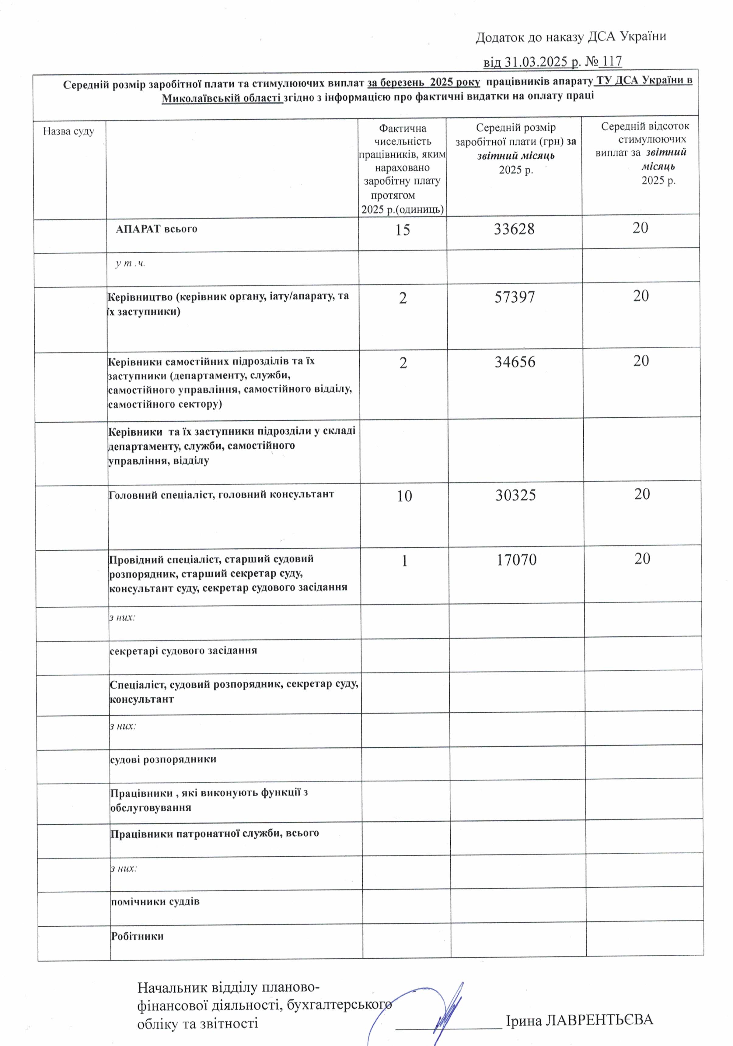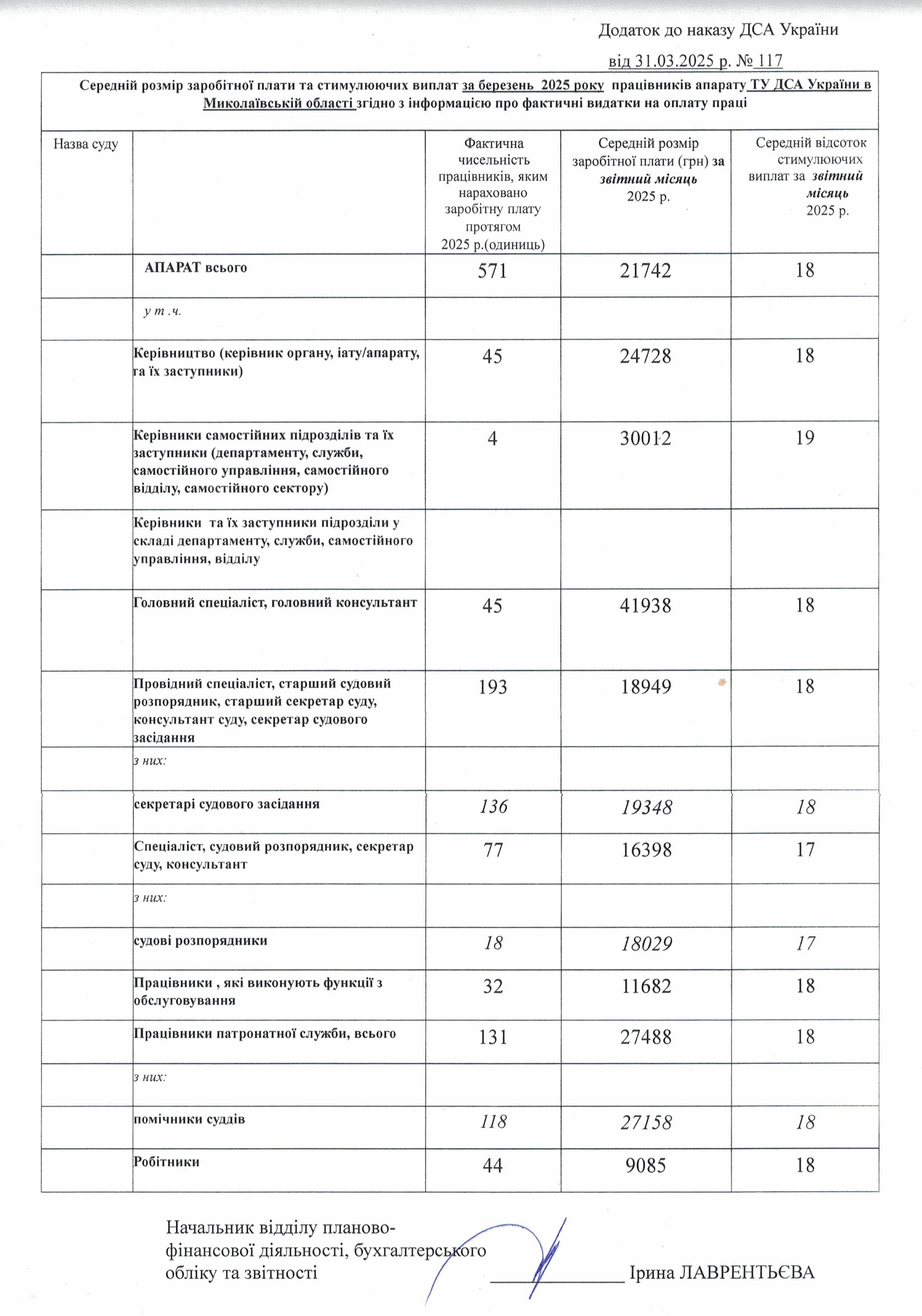 Середній розмір заробітної плати та стимулюючих виплат за березень 2025 року працівників апаратів ТУ ДСА України в Миколаївській області _ місцевих загальних судів Миколаївської області