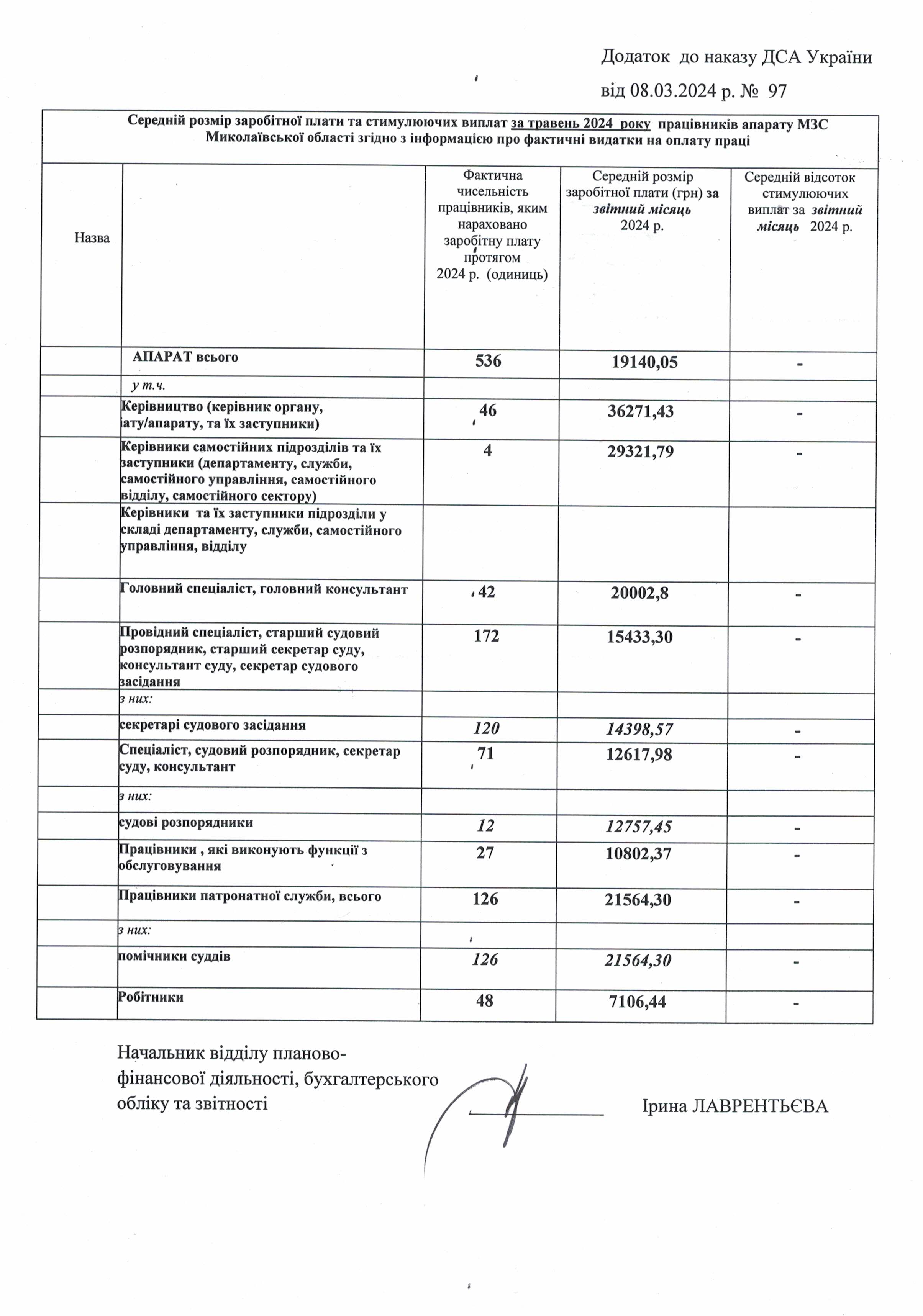 Середній розмір заробітної плати та стимулюючих виплат за травень 2024 року працівників апаратів місцевих загальних судів Миколаївської області