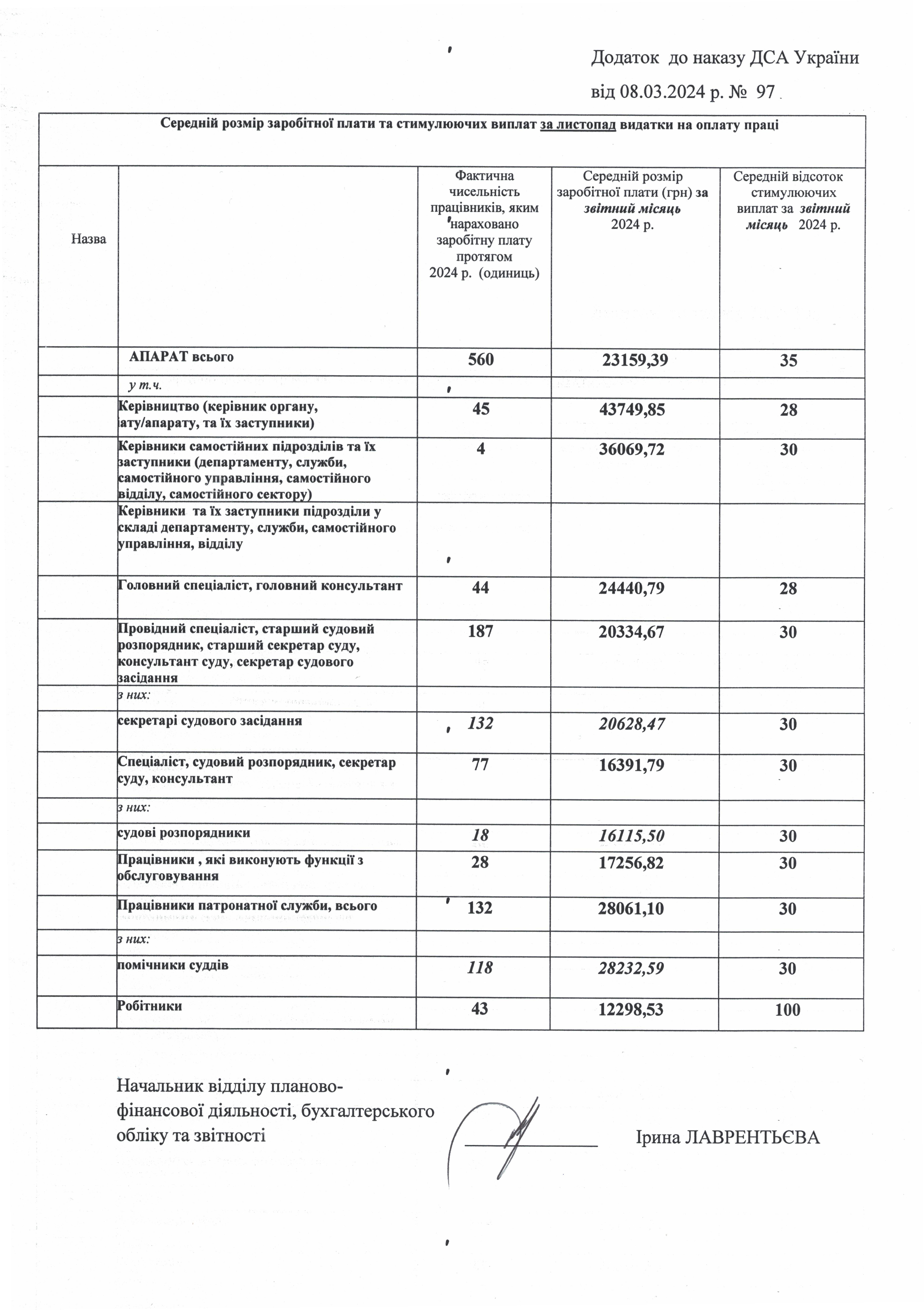 Середній розмір заробітної плати та стимулюючих виплат за листопад 2024 року працівників апаратів місцевих загальних судів Миколаївської області
