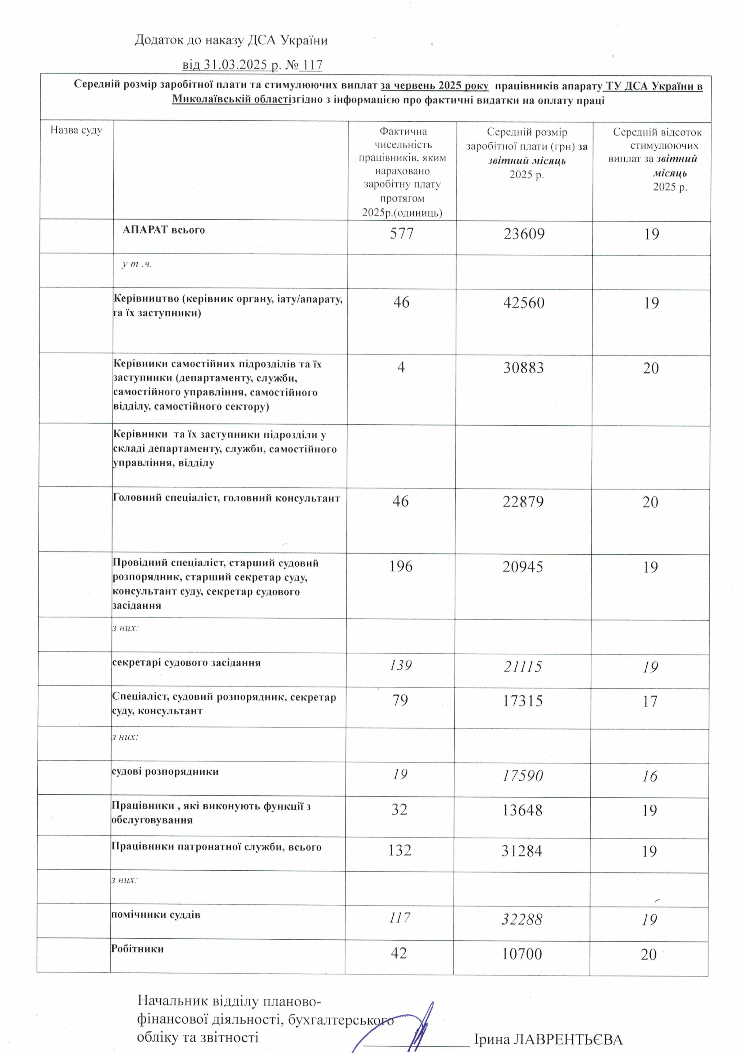 Середній розмір заробітної плати та стимулюючих виплат за червень 2025 року працівників апаратів ТУ ДСА України в Миколаївській області _ місцевих загальних судів Миколаївської області