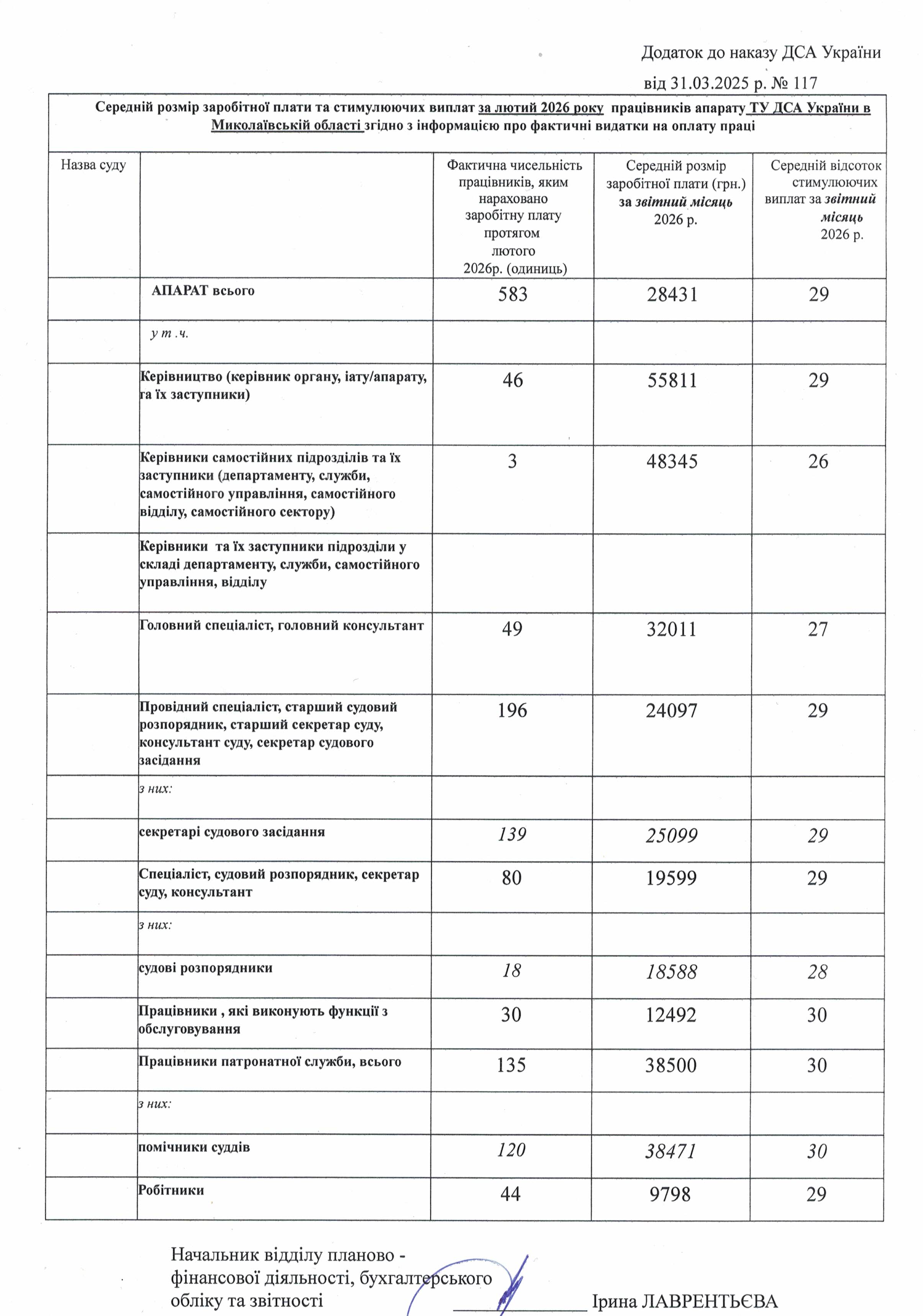 Інформація про середній розмір заробітної плати працівників апаратів місцевих загальних судів Миколаївської області